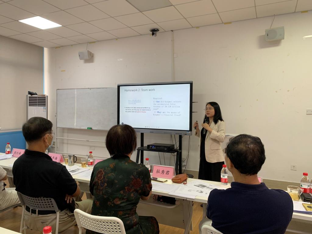 陈蒙梦老师从教学背景、教学方法、教学目标、教学流程、教学效果等五个部分介绍了《Intermediate Financial Accounting(双语)》课程的设计内容。并具体展示了“Chapter6 –Revenue and government grant”45分钟的课程设计,并就此知识点展开讲解,涉及课程回顾、新课导入、教学重难点、知识点讲解、课堂总结、课后作业及课后学习跟踪。