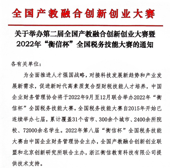 为培养新时代高素质复合型财税技能人才,由2022年第八届“衡信杯”全国税务技能大赛于2022年9月至12月举行,由中国企业财务管理协会主办,全国产教融合创新创业联盟和北京创新研究所联合主办,浙江衡信教育科技有限公司提供技术支持。“衡信杯”全国税务技能大赛自从2015年开始已连续举办七届,累计覆盖31个省市、300余个城市、2400余所院校、72000余名学生。