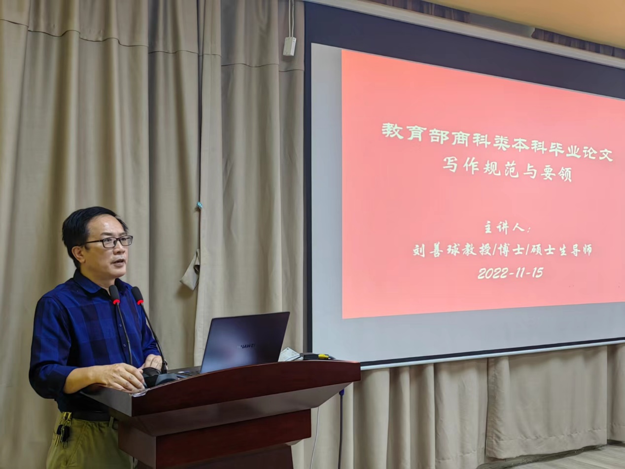 为规范本科毕业论文撰写要求,落实毕业论文的各项环节,稳步推进和部署2023届本科毕业论文指导工作,11月15日下午,bv伟德国际1946副院长刘善球教授在学院报告厅主持召开题为“教育部商科类本科毕业论文写作规范与要领”的专题指导讲座。伟德国际victor1946副校长兼bv伟德国际1946院长陈美华教授,bv伟德国际1946副院长杨旻、周书域,各教学系、教研室、实验区负责人及全体专任教师参加了讲座。