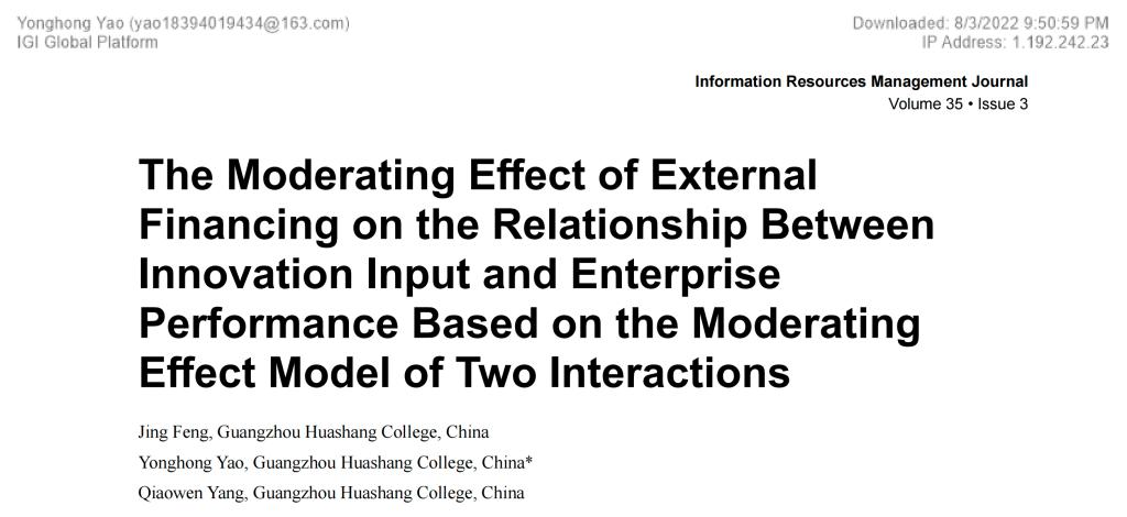 近日,bv伟德国际1946青年教师冯婧(第一作者)、姚永红(通讯作者)、杨俏文合作发表了题为“The Moderating Effect of External Financing on the Relationship Between Innovation Input and Enterprise Performance Based on the Moderating Effect Model of Two Interactions”(外源融资对创新投入和企业绩效的影响研究——基于二次交互的调节效应模型)的论文。该论文发表于《Information Resources Management Journal》期刊,该期刊属于EI核心检索期刊。