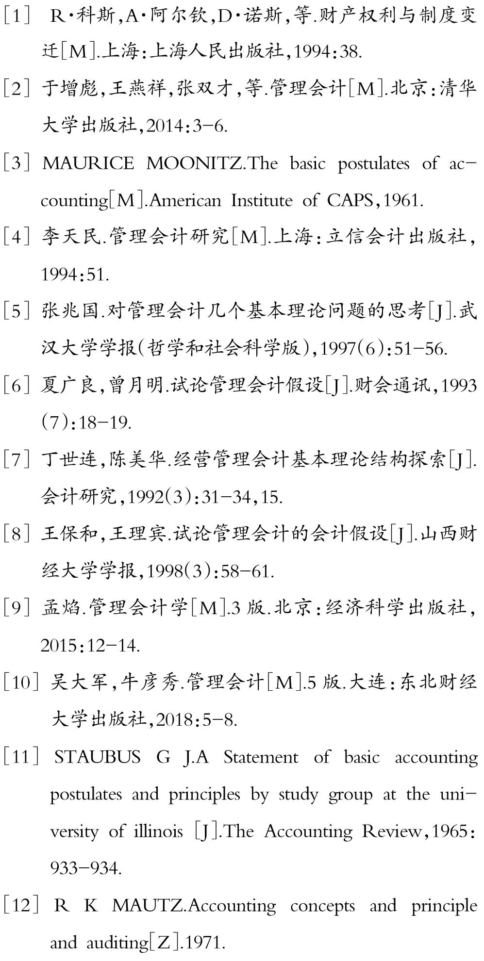 国内一些研究者在会计假设的基础上提出了管理会计的基本假设。李天民[4]认为,管理会计假设包括会计主体、会计分期、持续经营、货币计量、成本分类和效益最大化等。张兆国[5]认为,管理会计的基本假设一般由会计主体、持续经营与寿命期经营、会计分期、资金时间价值和暂时性等构成。夏广良等[6]认为,管理会计具备管理会计主体、继续经营和会计分期、货币时间价值和成本性态可分等假设。