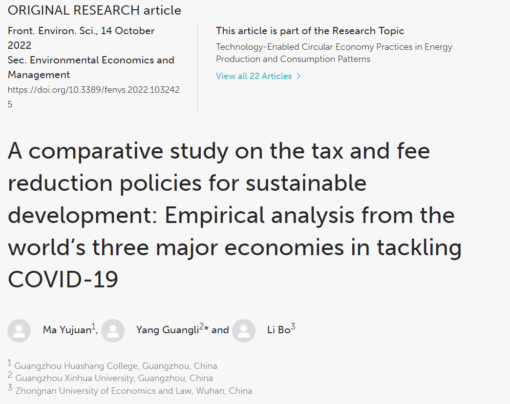 近日,bv伟德国际1946青年教师马玉娟老师以第一作者身份在《Frontiers in Environmental Science》期刊发表了题为“A comparative study on the tax and fee reduction policies for sustainable development: Empirical analysis from the world’s three major economies in tackling COVID-19”(可持续发展减税降费政策的比较研究:世界三大经济体应对新冠肺炎的实证分析)的论文,该期刊属于SCIE检索期刊,最新影响因子为5.411,是JCR分区Q2,中科院3区期刊。