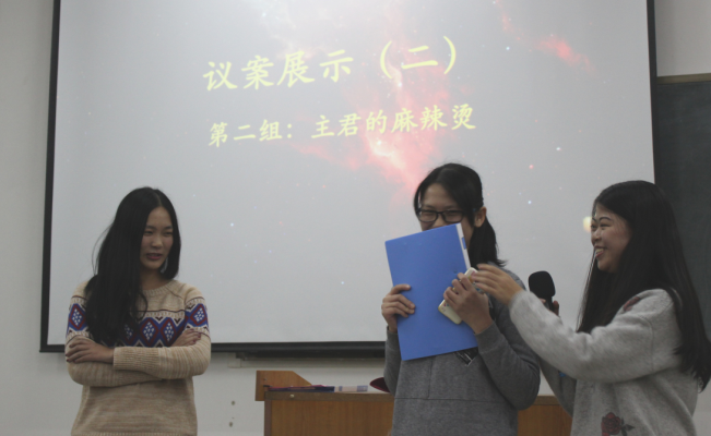 在三组特工阐述完他们的议案后,现场观众进行了投票,选出心目中最具认同的议案,而在工作人员进行计票的同时现场进行了游戏环节,以缓解现场的紧张气氛。最终,霸气侧漏组获得了“最具认同议案奖”,而团总支书记梁银雄也对其进行了颁奖。