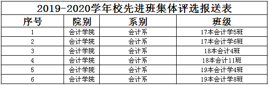 根据《华商学院﹝2020﹞17号关于做好2019-2020学年学生综合测评和优秀生、优秀学生干部、先进班集体评选工作的通知》文件精神,并依据《广东财经大学华商学院先进班集体评选奖励办法》(见2019版《学生手册》)的要求,经过班级申请及学院评审,拟推荐17本会计学5班、17本会计学6班、18本会计4班、18本会计11班、19本会计学4班和19本会计学8班为2019-2020学年bv伟德国际1946先进班集体,报请学校审核批准。