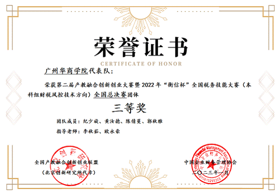 由李秋茹、欧永豪老师指导,纪少旋、黄汝德、陈倩蔓、郭秋雅4名同学组成的代表队在历时2个月的比赛中克服各种困难,积极备赛,荣获全国总决赛(本科组财税风控技术方向)团体三等奖的优异成绩,充分展现新时代华商学子奋发有为的风采!
