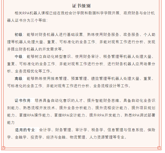 根据广东省职业技能等级证书管理平台和主考机构安排,我校被广东省教育厅批准成为2023年政府财务与会计机器人职业技能等级证书考试试点机构。2023年上半年考试定在5月20日在厚德楼进行。bv伟德国际1946近年大力促进应用型本科院校大学生就业核心竞争力和智能财务实践能力建设,努力为同学搭建高质量的实训教学平台和实践练习条件,彰显了“岗课赛证融合“人才培养理念,受到毕业实习及用人单位的一致好评。