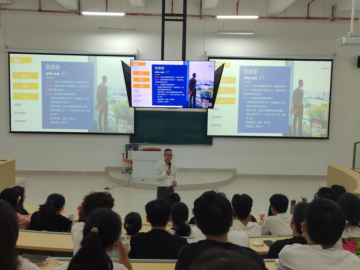 温建林总经理首先从“职业、职位、目标”开场,并列举赖平、稻盛和夫等名人案例,开篇启发学生对什么是梦想的思考和热烈讨论。梦想是无界限的,不要惧怕前路会如何,原地踏步才最可怕。