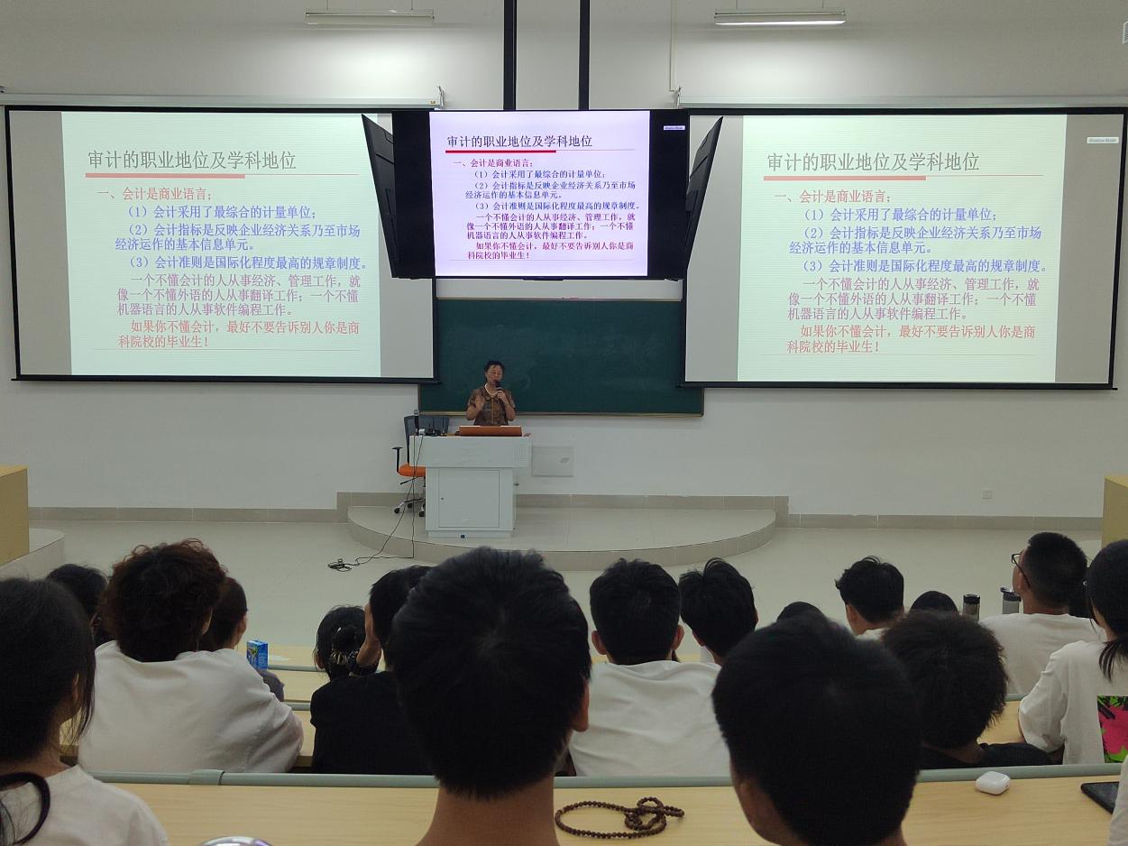 新生教育讲座的第二部分是由审计系郭秀珍教授介绍审计专业相关情况。郭教授从审计学学科特点,给新生同学们介绍审计的职业地位及学科地位,让同学们对审计学科有一个初步的认知。郭教授还从人才培养方案入手对审计专业课程设置进行介绍,清晰告诉同学们大学四年课程的设置情况,让同学们对大学四年所学课程有一个基本的了解。最后郭教授鼓励同学们要提早做好职业规划,无论是毕业考公、考研还是考CPA去事务所,都需要提前做好规划。