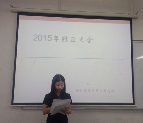 然后,由7名中共预备党员上台宣读自己的转正申请书,再由正式党员举手表决。各位中共预备党员都获得全票通过,成为我们华商bv伟德国际1946学生第三党支部的一员。