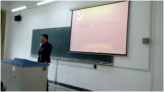随后,陈洋广书记教育我们该如何做好一名大学生党员。第一、目标明确,勤奋学习,把优良的学习成绩作为我们学生党员的“第一要务”;第二、博览群书,开拓视野,作一个有一技之长的综合型、高素质人才,加强思想品德修养,作一名高尚的学生党员;第三、热爱祖国,热爱人民,既要有振兴中华,为全国人民乃至全人类造福的远大目标,更要把为人民服务落在小处,落在实处。并对如何做好一名大学生党员进行了交流与讨论,对此,曾雪平等几位同志积极发言。最后,陈洋广书记宣布本次的党课学习圆满结束。