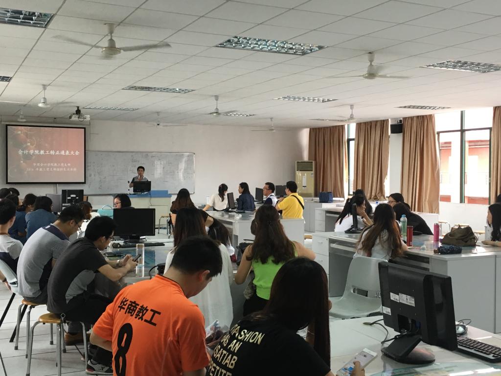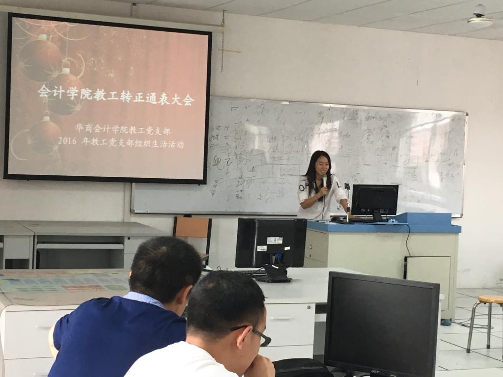 2016年4月26日下午,华商bv伟德国际1946教工党支部在厚德楼A507教室隆重举行了该年度预备党员转正及通表大会,出席本次大会的有华商bv伟德国际1946教工党支部书记王敏和全体教工党员。