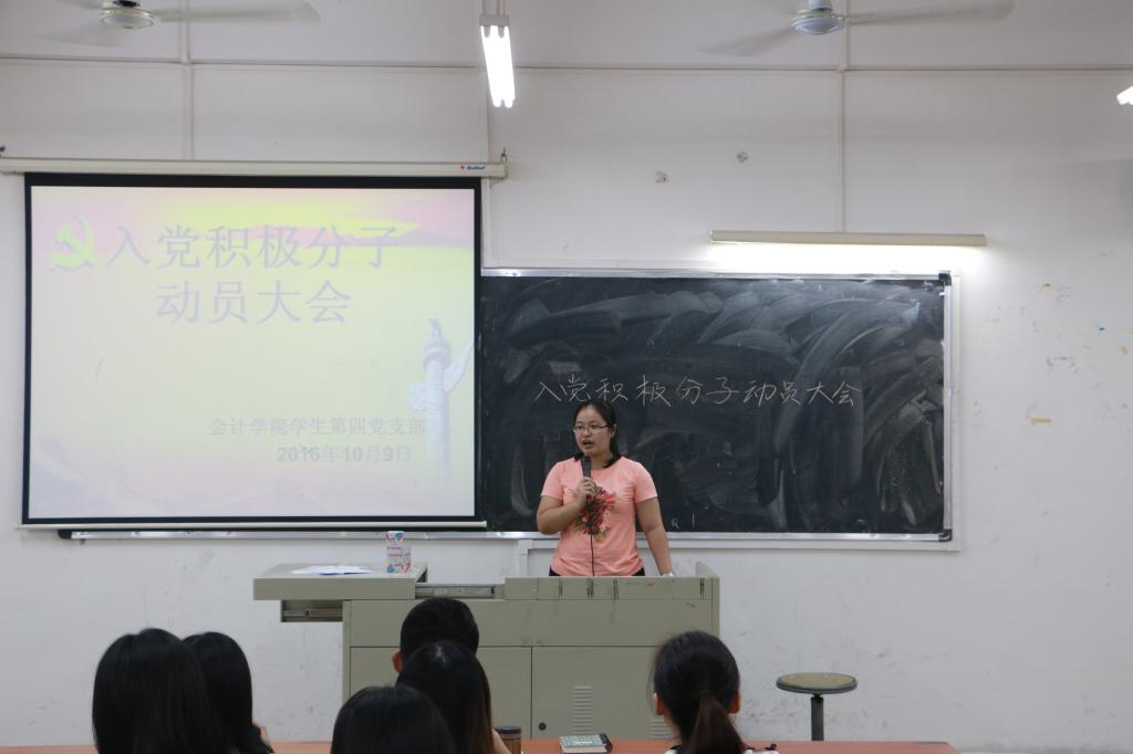 2016年10月9日晚上19时30分,广东财经大学华商bv伟德国际1946学生第四党支部入党积极分子动员大会在厚德楼C405如期举行,出席本次会议的有学生第四党支部支委和第四党支部第59期入党积极分子,这次大会为学生第四党支部注入了新的血液与活力,使党支部变得更有活力与动力,提高了大家的工作积极性。