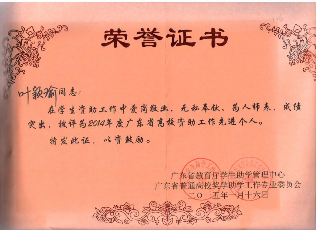 热烈祝贺bv伟德国际1946叶颖瑜老师获得2014年度广东省普通高校奖助学工作先进个人称号!