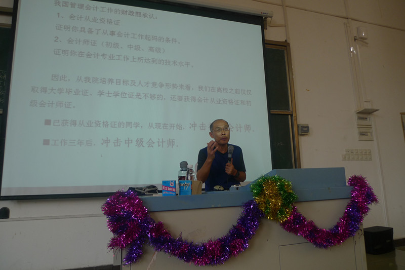 讲座伊始,陈东生教授为大家分析了为什么在大学四年学习期间冲击初级会计师,并给大家规划了考证的最佳时期。紧接着,陈教授详细地说明了初级会计职称考试的科目、时间和方式,同时对今年的初级会计职称考试的考题做出了相应的预测,并为大家推荐了一些关于考初级会计职称考试的书籍。随后,陈教授还与大家分享了在备考初级会计职称考试时,需要注意的几个重点和技巧,向大家提出一些备考上的建议,帮助同学们能有计划的、有效率的进行备考。讲座最后,陈教授为同学们送上寄语,预祝同学们冲击初级会计职称考试成功,也鼓励同学们要情有独钟,痴心不改地去实现梦想。