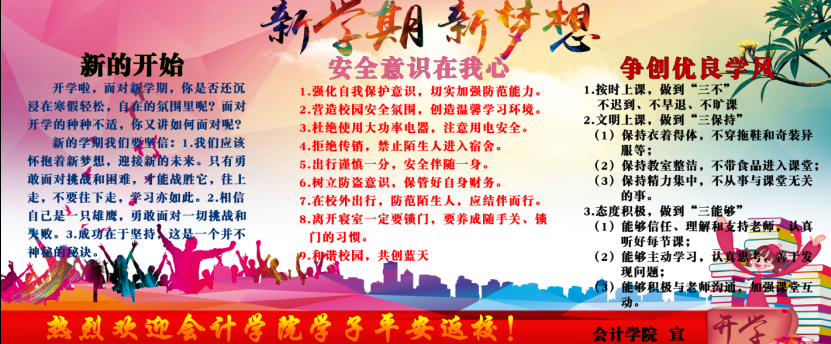新学期,新梦想。一个假期的分别,为的是期待新的重逢;一个假期的思考,为的是收获新的成长;一个假期的放松,为的是焕发新的生机。返回熟悉的校园,背包里满载新的见闻,脚下承载新的渴望。那一张张笑脸中,洋溢着一份自信,更写满了憧憬。步入知识的殿堂,打开扉页,翰墨书香中,智慧的传承与创新将再次谱写崭新的教育篇章。
