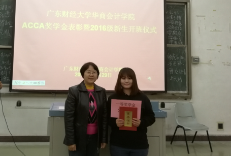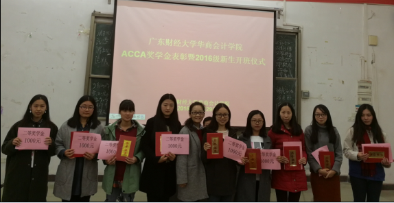 其次,许娜副院长宣读华商bv伟德国际1946ACCA奖学金评选办法和2016年ACCA学生获奖名单。bv伟德国际1946领导和中博诚通董事师韫分别为获得一二三等奖学金的ACCA优秀学生颁发了奖金和荣誉证书。一等奖学金获得者——13级ACCA班陈春谨同学作为代表,给同学们分享了ACCA的学习心得和体会。
