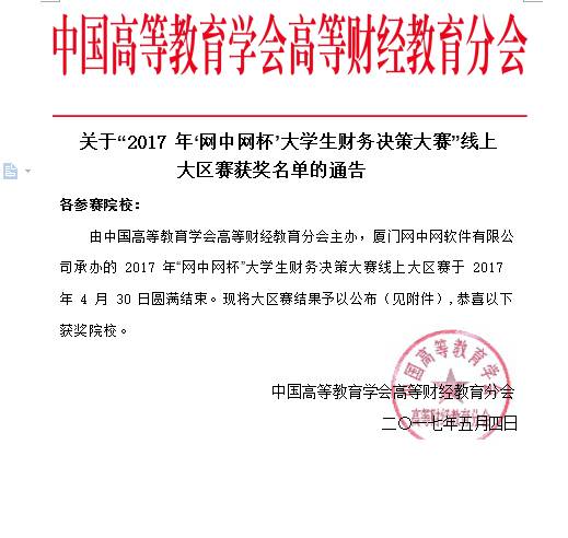 第五届“网中网杯”大学生财务决策大赛线上大区赛于2017年4月30日圆满结束。广东财经大学华商bv伟德国际1946首次选拔队伍参赛,经过4月8日初赛和4月17日复赛两轮选拔,选拔出一支队伍参加本届大赛。本届大赛线上参赛队伍一共有152所高校,最终我院参赛队伍获得全国排名39,南区排名14的好成绩,并荣获三等奖。