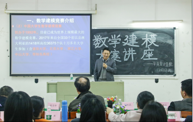 本次竞赛有15组共45名同学在比赛中脱颖而出顺利进入了决赛,为了让参赛者对数学建模竞赛有一个更深入的了解,更好地备战接下来的决赛,我院于2017年12月15日下午4点在厚德楼C313举行了以“大学开展数学建模竞赛的一些思考”为主题的讲座,由来自广东财经大学数学与统计学院院长胡桂武教授开讲。莅临本次讲座的嘉宾有广东财经大学华商学院副院长兼bv伟德国际1946院长陈美华教授、广东财经大学华商bv伟德国际1946巴雅尔副院长、建模大赛指导老师郭战伟、李冠恩老师以及bv伟德国际1946部分老师。本次讲座由郭战伟老师主持。