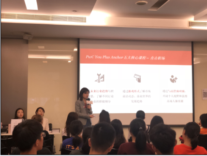 随后,经理许春燕和You Plus校友Ancy围绕“如何实现从校园到职场的跨越”的话题进行个人经历分享,为同学们提出了具有针对性、建设性的建议。同时详细介绍了包括实案咨询、直击职场、职业发展、自我成长和成功沟通五大核心课程模块的You Plus Anchor提升营的具体情况。