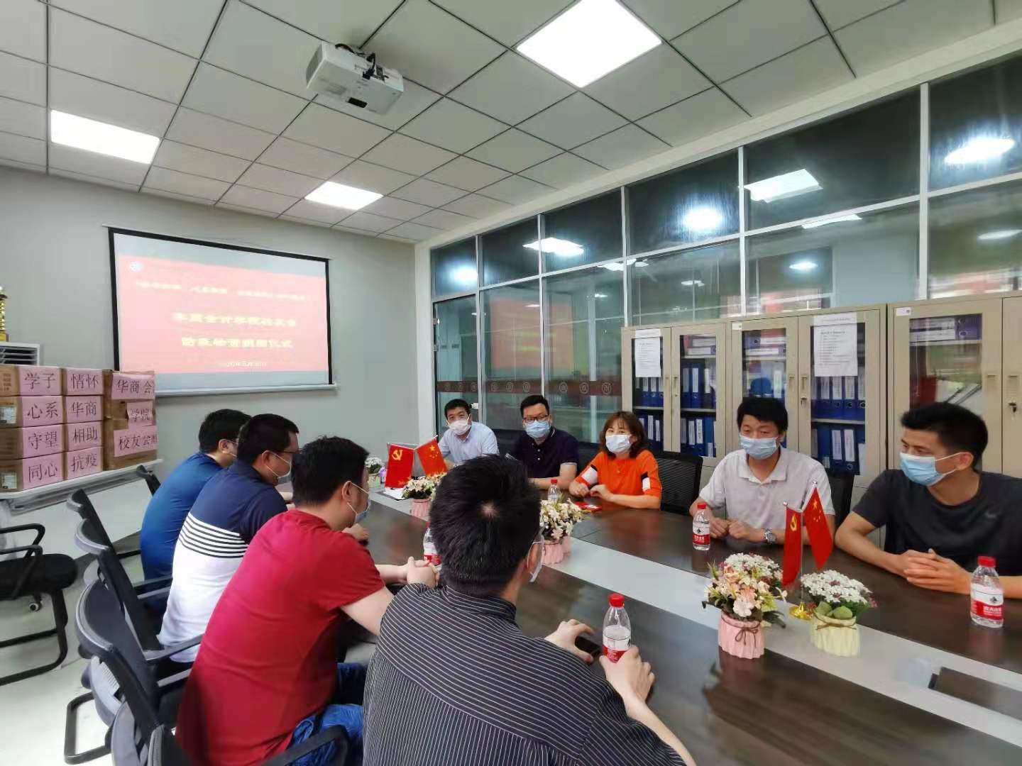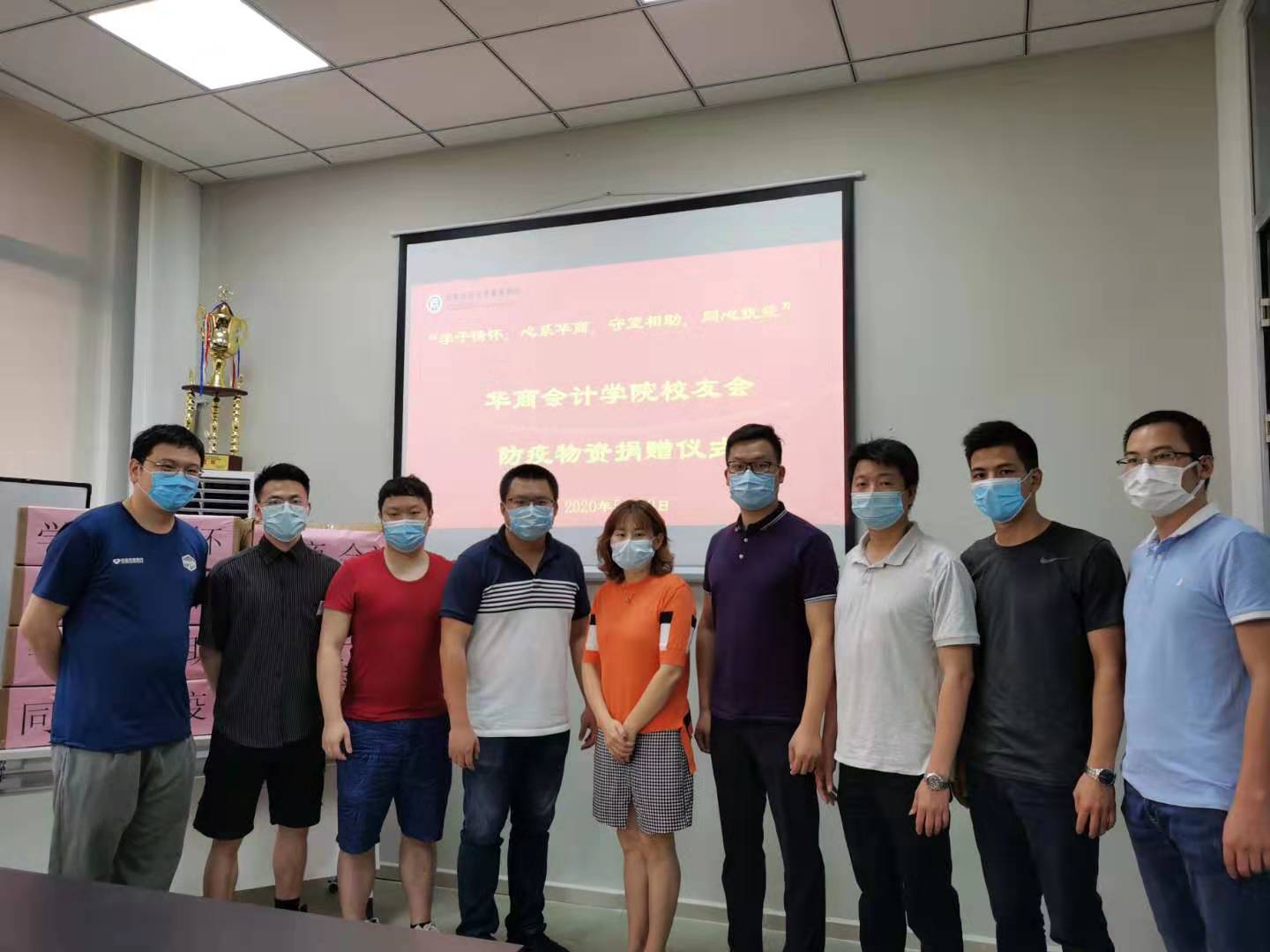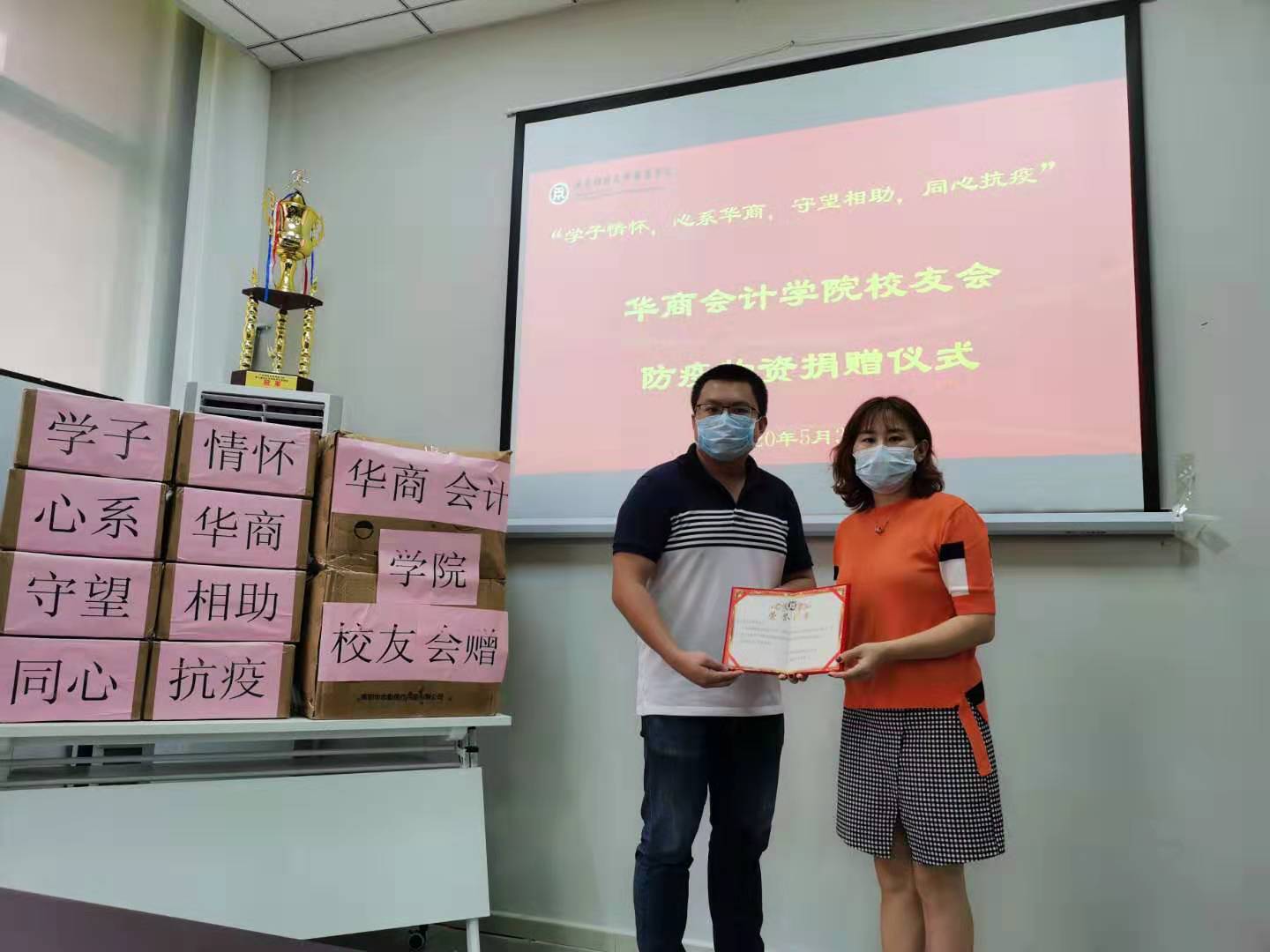 防疫物资捐赠仪式在华商bv伟德国际1946会议室举行。校长助理、bv伟德国际1946副院长许娜,bv伟德国际1946学工办副主任陈洋广、校友工作办主任吴泽佳等出席了捐赠仪式。副院长许娜代表bv伟德国际1946接受捐赠并向华商bv伟德国际1946校友会颁发了捐赠证书。
