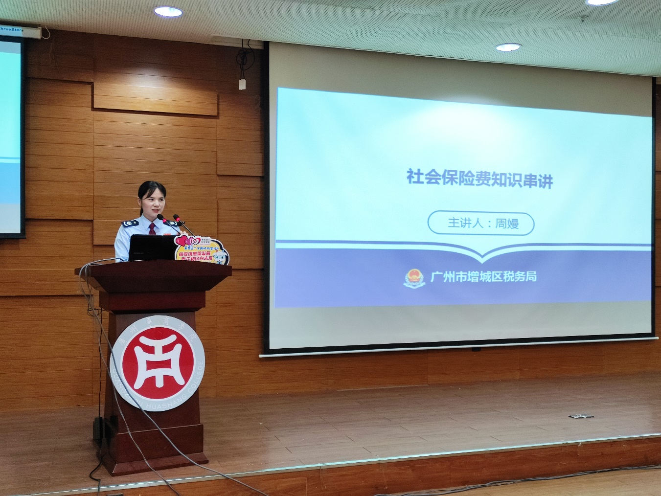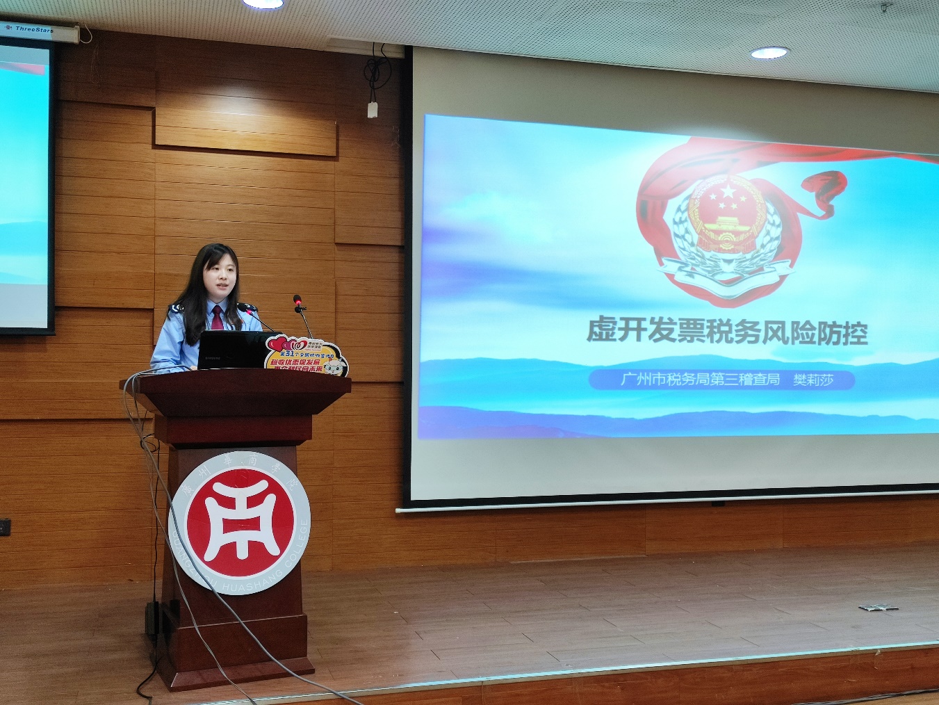 在随后宣讲环节中,国家税务总局广州市增城区税务局干部项小辉、国家税务总局广州市税务局第三稽查局干部樊莉莎以及国家税务总局广州市增城区税务局干部周嫚着眼“大众创新、万众创业”、税务稽查、平台经济等社会热点,分别以“大学生创业税收优惠政策”“虚开发票税务风险防控”以及“灵活就业人员社保参保缴费”为主题展开税收政策宣讲,给同学们进行了深入浅出的讲解。