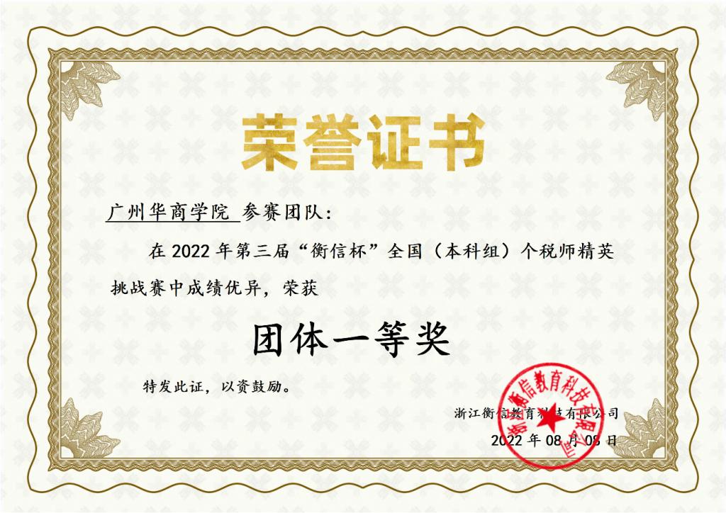 第三届“衡信杯”全国个税师精英挑战赛由浙江衡信教育科技有限公司举办,比赛自2022年7月12日开赛,得到了全国各地院校的广泛参与,超过400所学校2万名学生参赛。我院学生张增镇、许雪莹、黄万达、孔婉宜、刘雨彤、邓倩瑜、麦竣皓、孙鑫、严子淇、易思妤、杜雪霖组成的队伍在众多参赛队伍中崭露头角,荣获团体一等奖。