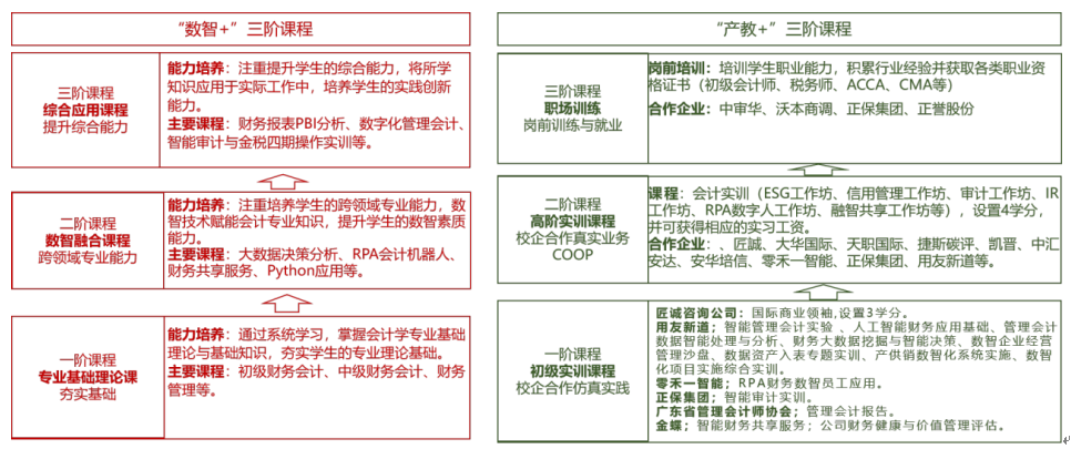 在这里,以“AI+专业”重构专业方向,以“AI+课程”“跨学科+课程”和“产教+课程”重构课程体系,与企业联合设立融智共享、审计与评估、ESG报告、投融资与信用管理、RPA数字员工等5个工作坊驱动实战,培养具有数据思维与价值财会和战略财会人才,实现了传统的会计专业向数字时代会计专业转型。