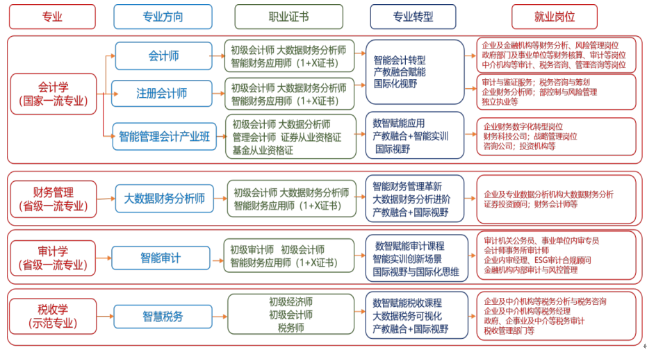 在这里,设置会计学、财务管理、审计学、税收学四大专业,设置会计师、注册会计师、智能管理会计产业班、大数据财务分析师、智能审计、智慧税务等相互支撑与促进的专业方向。入学后可参加“ACCA卓越班”遴选。通过支持学生参加各类学科竞赛、组织参加各类专业资格证书考试及组织参加境内外各类研学活动,提升学生就业竞争力。