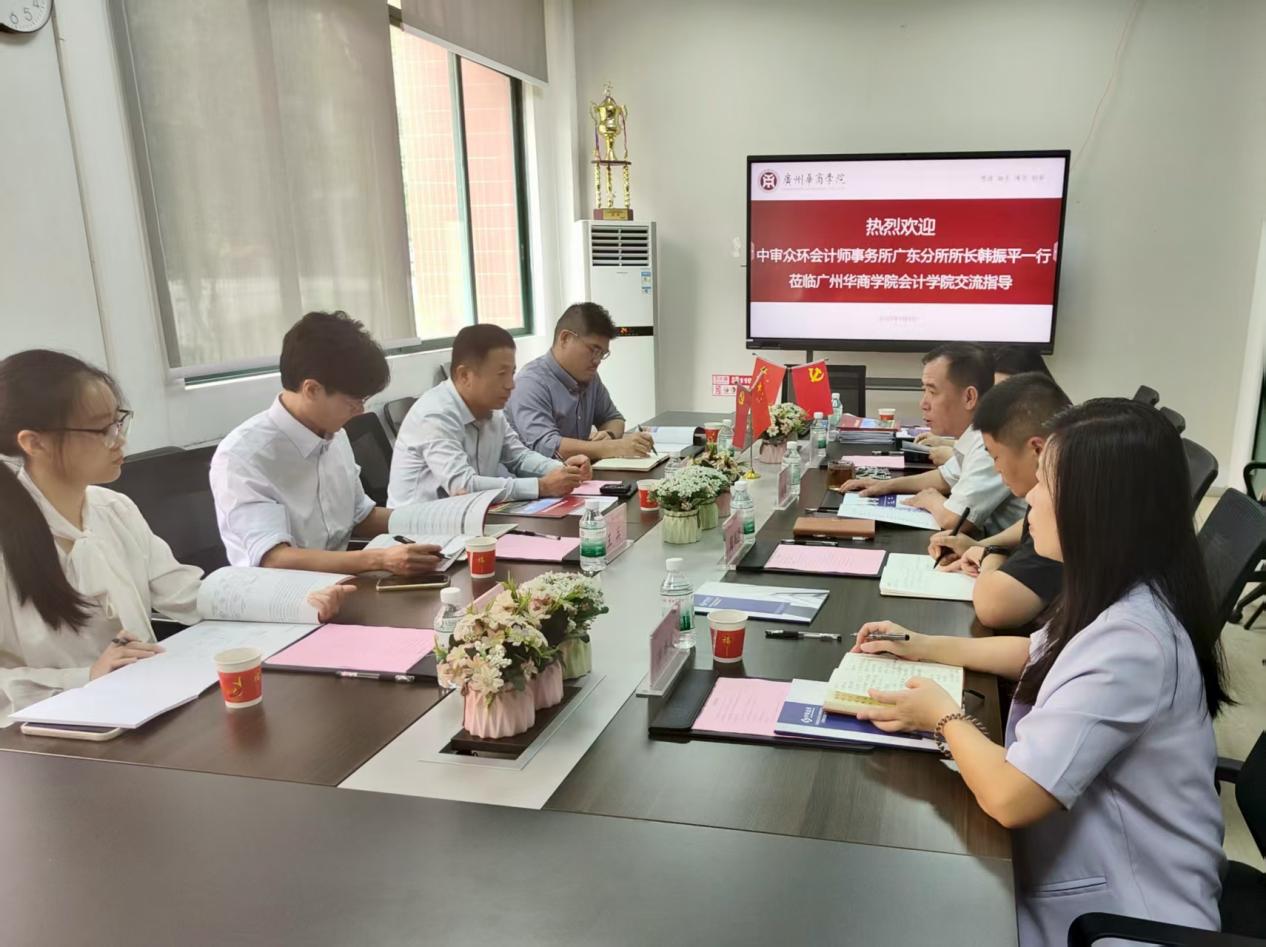 2025年9月8日,中审众环会计师事务所广东分所所长韩振平、副所长王兵、部门经理吴梓豪、人事专员刘曦乐一行莅临我院,就进一步加强产教融合和深化校企合作进行了深入交流。院长姚凤民,副院长周书域,院长助理陈蒙梦,毕业班辅导员湛秀枝,会计系教师郭柳云参加座谈会,会议由副院长周书域主持。