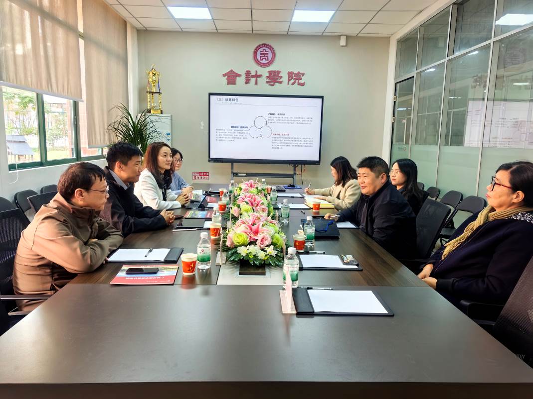 交流会伊始,副院长周书域对徐立文常务副院长一行的到来表示热烈欢迎,随后他从办学历史、学科建设、专业建设、课程建设、实验与实践教学体系建设、师资队伍建设、产教融合、办学特色等方面介绍了学院的基本情况。院长助理陈蒙梦重点介绍了学院国际化办学特色、办学成果及数智会计与商务服务产业学院赋能学院产教融合工作。会计系主任唐丽华介绍了会计学专业建设,突出“产教融合+课程思政”,通过课程建设推进五融合,打造了“校内实训平台+实验室+校外实践基地”的三级实验实习体系,让学生在学中做,做中学。财务系主任姚永红则从实验班及特色班建设、鼓励学生考证等方面介绍了财务管理专业的建设经验。