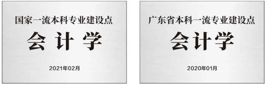 会计学科被列为广东省特色重点学科(2017年);会计学专业获批国家级一流本科专业建设点(2021年);广东省首批一流本科专业建设点(2020 年 1 月);会计专业硕士学位授权建设点(2021 年 5 月);拥有会计学专业省级课程思政团队、会计学专业省级教学团队;省级专业综合改革试点专业、省级国际会计 (ACCA) 人才培养模式创新实验区(2017年)、省级专项人才培养计划(国际会计人才培养卓越创新班,2021年)。