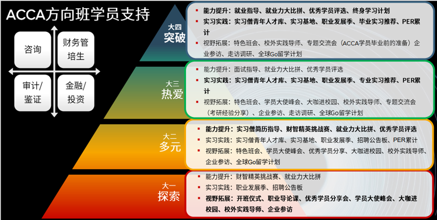 毕业前根据学生参加ACCA全球统一考试通过科目数量及平时成绩综合评定,给予奖励500-10000元奖励(通过一门奖励500元,免考科目除外,第6学期结束前通过前9门奖励8000元);