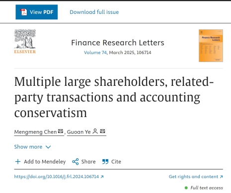 bv伟德国际1946陈蒙梦副教授团队的论文《Multiple large shareholders, related-party transactions andaccounting conservatism》在《Finance Research Letters》2025年第74卷(Volume 74, March 2025)发表。Finance Research Letters是一本以Business和Finance综合研究为特色的国际期刊。该刊由Elsevier出版商创刊于2004年,为JCRQ1期刊,中科院TOP 2区,澳大利亚商学院院长理事会(ABDC)评级A类期刊,期刊影响因子为7.4。
