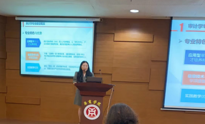 随后,伟德国际victor1946审计系张丽副主任以“审计学省级一流专业建设”为主题进行经验分享。首先,她介绍了审计学专业建设概况,并强调了该专业的特色与优势;其次,对审计学的专业建设阶段性成果进行说明,主要从人才培养方案、课程建设、教材建设、实践教学、师资队伍建设、人才培养质量等维度展开,展示了本校在一流专业建设下的累累硕果,也为在场来宾提供了举措借鉴;最后,对一流专业建设的不足之处及未来展望进行分析,认为目前还存在着人才陪养方案未体现办学特色、标志性教科研成果不突出等相关问题,并针对以上问题提供了专业未来建设计划以供学者们参考。
