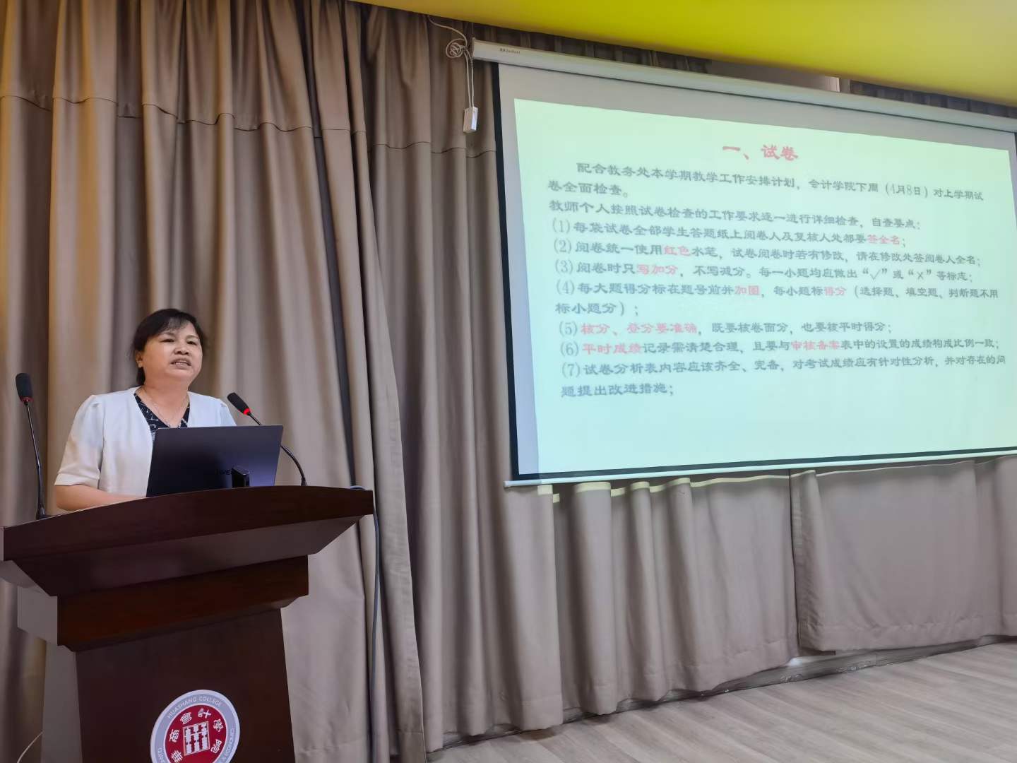 杨旻副院长首先传达了3月26日学校教学工作例会的会议精神,从试卷、毕业论文、课程建设、课堂教学及人才培养方案五个方面详细介绍了本学期教育教学的工作重点,分别做了以下工作安排:1.制定试卷自查方案,对照试卷归档要求,开展试卷全面检查;2.布置毕业论文定稿及学院答辩工作;3.按照合格课程、融合课程及一流课程三个层级完成课程建设工作4.做好教学材料的修改完善及期中教学检查准备工作;5.启动2025版OBE理念下的人才培养方案编制工作。