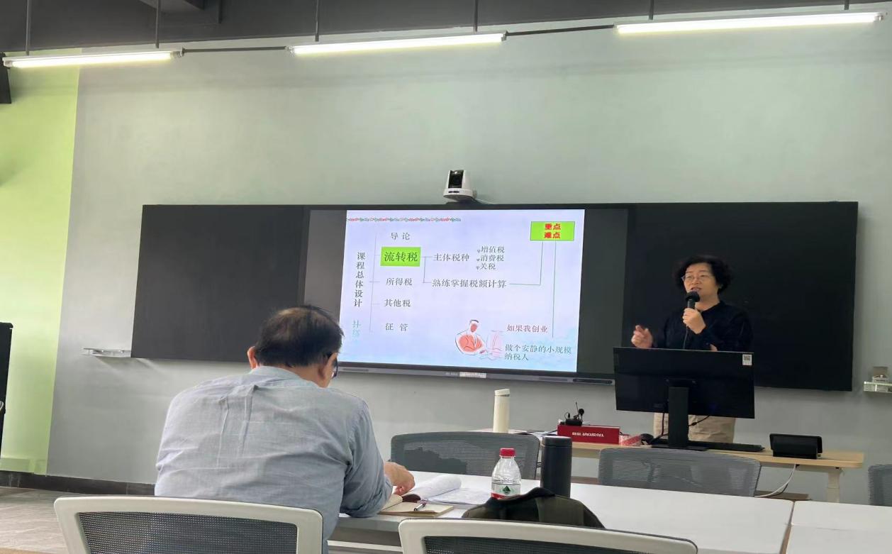 高艳荣教授讲的是《税法》中的第三章“消费税”。高教授从课程总体设计、学情分析、教材选定、教学策略、教学过程和板书设计等六个方面对税法课程进行说课,并选取消费税应纳税额的处理进行讲授。高教授的课程安排重难点突出,教学安排条理清晰;PPT设计精致、令人观感愉悦。在消费税税目的学习中,高教授以铁人王进喜的事项引入消费税税目之一“石油”,并在此基础上衍生教学,令人印象深刻;税目介绍环节适当引入的税法思政元素,更是在无形之中引导学生要绿色消费、合理消费。高教授的授课过程充满了岁月的积淀和知识的厚度,层层递进、如一幅美丽的画卷缓缓展开,让观摩的老师们受益匪浅。