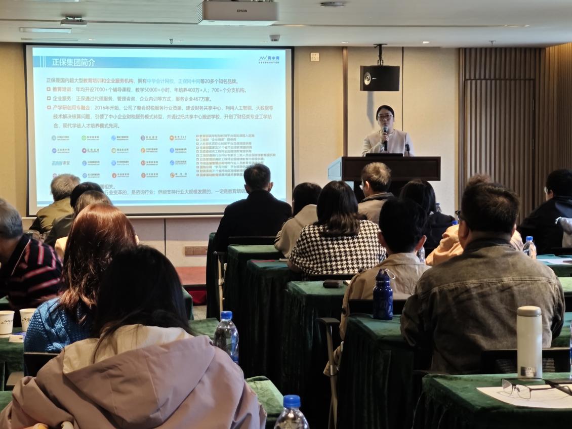 会议第一项议程,正保网中网产品研发总监张亚男女士发表了题为“智能会计专业体系建设与人才培养”的演讲,围绕智能会计专业建设与人才培养展开,先介绍正保集团及网中网公司,分析目前会计行业背景和人才需求,阐述关于智能会计的院校课程实践与企业实践,针对存在的教育痛点提出改革方向,同时她还针对探索 AI 融合教育以及教育改革提出了愿景和多项举措。