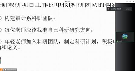 之后,为了助力审计系教科研人才的培养,刘善球副院长深入分析了青年教师在教科研方面面临的新机遇、新挑战,剖析了与一流课程、一流专业等建设目标相比,系部在人才队伍、学科建设、科研水平等诸多方面存在的差距,清晰地描绘了青年教师未来教科研工作的努力方向和工作任务,为审计系教科研项目和团队的发展加足了动力,指明了方向。