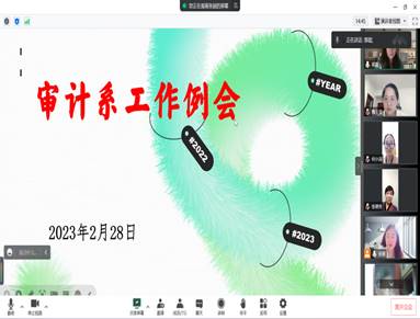 为贯彻落实bv伟德国际1946新学期教职工大会的会议精神,进一步强化教学管理,提高教学质量,充分激发青年教师对科研的热情,并促进教师间教科研工作经验交流,2月28日晚上,bv伟德国际1946审计系召开了2022-2023学年春季学期工作视频会议。bv伟德国际1946副院长刘善球、审计系主任郭秀珍出席会议并发表讲话。会议由审计系副主任张丽主持并作工作部署,审计系各课程负责人及所有专任教师共同参加了本次会议。