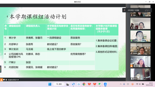 随后,张丽副主任对本学期审计系教研室活动做出总体指导,并由教研室主任马玉娟进行具体工作安排。马玉娟主任主要对教研室整个学期的教研活动主题与时间做出了详尽计划,同时指出了审计系各课程组教研活动中需解决的,如教材建设、思政案例库建设等核心问题。
