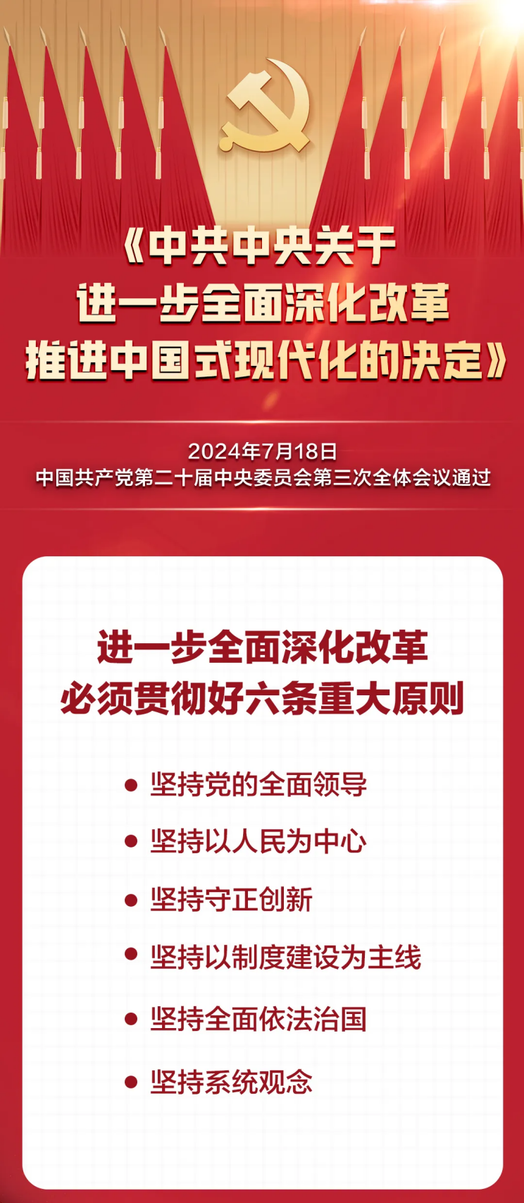 党的二十届三中全会是在以中国式现代化全面推进强国建设、民族复兴伟业的关键时期举行的一次十分重要的会议。会议通过的《中共中央关于进一步全面深化改革、推进中国式现代化的决定》,科学谋划了围绕中国式现代化进一步全面深化改革的总体部署,明确了进一步全面深化改革的指导思想、总目标、重大原则,重点部署了未来五年的重大改革举措,是指导新征程上进一步全面深化改革的纲领性文件。学习好贯彻好党的二十届三中全会精神,是当前和今后一个时期全党全国的一项重大政治任务。