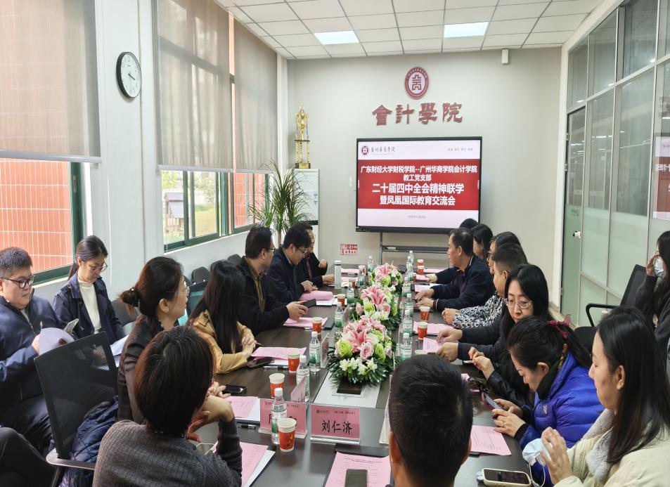 2025年11月20日,bv伟德国际1946党委与广东财经大学财政税务学院党委开展“党的二十届四中全会精神联学暨凤凰国际教育交流会议”,此次会议以支部联学为纽带,创新理论学习与教育交流形式,为国际教育高质量发展搭建合作平台。凤凰国际教育董事兼总经理兼马来西亚双威学院驻中国首席代表吕资慧、副总经理李健、项目经理汪雨杭、广州国际人才交流协会主任秦亚慧,广东财经大学财政税务学院党委书记刘文基、副院长朱翠华、支部书记邝艳华、财税系副主任于井远及教师代表丁宇红、刘仁济、陈超阳,bv伟德国际1946党委委员、院长姚凤民、教师第一党支部书记、院长助理陈蒙梦、院长助理陈平、会计系主任唐丽华、党委委员、学工办主任杨烨瀚及教工第一党支部教师代表共同参会,会议由bv伟德国际1946教工第一党支部书记、院长助理陈蒙梦主持。