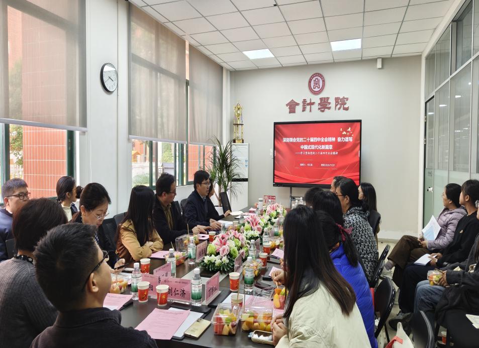 随后,广东财经大学财政税务学院党委书记刘文基带领全体同志深入学习党的二十届四中全会精神。学习内容围绕全会的基本情况介绍和文件起草过程、深刻认识全会的重大历史意义与核心成果、准确把握全会精神的核心要义与实践要求、深刻领会一体推进教育科技人才发展这四个方面系统展开。在随后的交流讨论中,与会人员围绕党建引领、支部建设与业务融合等议题展开热烈研讨,共同探索以高质量党建推动教育事业高质量发展的实践路径。