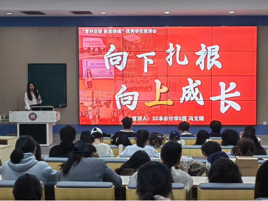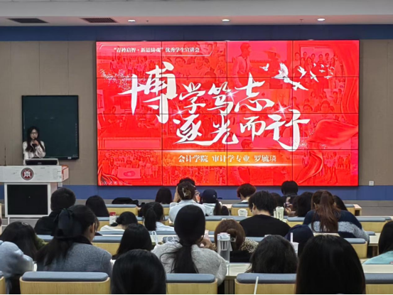 本次宣讲会以“青衿启智,新思铸魂”为主题,分两期开展,四位优秀学生代表从学业规划、实践创新、志愿服务等多维度分享经验,展现了华商学子积极向上的精神风貌。