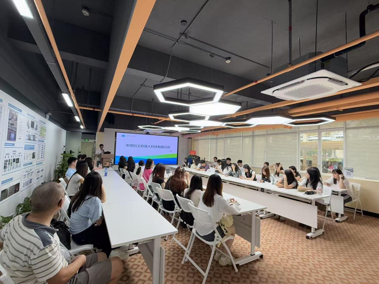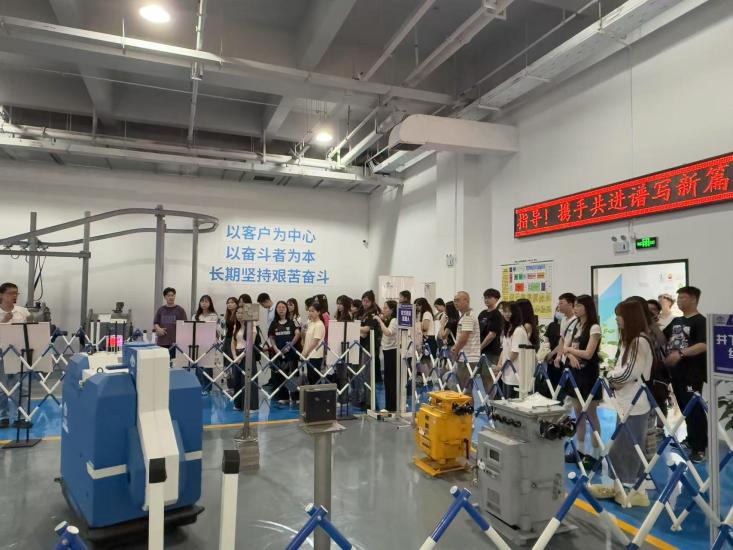 马博主任带学生步入产品陈列区,各类机器人产品与宣传影片引发学生热烈讨论。随后,测试工程师对企业的机器人产品进行了技术零距离创新介绍与互动汇报。透过汇报,学生了解了机器人的分类分级体系、矿山机器人的研发初衷、技术架构、功能特点及应用场景。其中,“领航者3”轮式机器人搭载的智能温控与视觉监控模块,可实现设备损耗评估与安全隐患溯源;管道安装机器人、瓦斯检测机器人等特种设备,通过作业流程标准化与应急响应数字化,显著提升了作业安全性和效率。这些机器人技术的发展让学生不禁感叹新质生产力对安全生产与数字化发展的重要性。