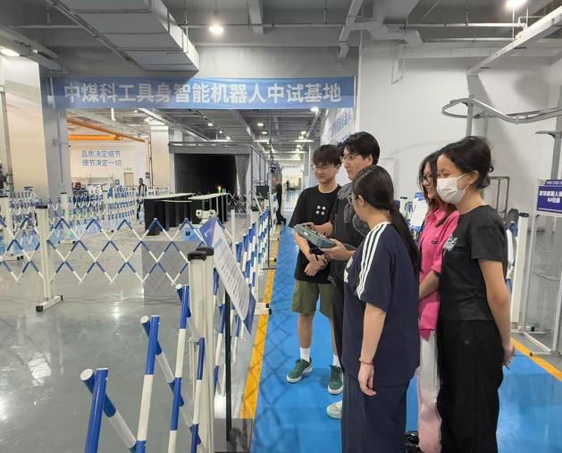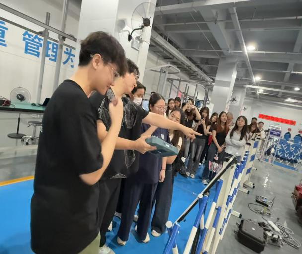进入矿山仿真实验室,学生们十分踊跃地参与了现场互动环节。同学们分组进行了学习操作,体验了测试现场的2台履带遥控机器人和6台轮式机器人,零距离感受机器人的强大。通过亲手操作机器人完成模拟救援任务,学生将课堂中的风险评估模型与真实场景中的设备故障预警系统相印证,深化了“技术赋能”的认知。
