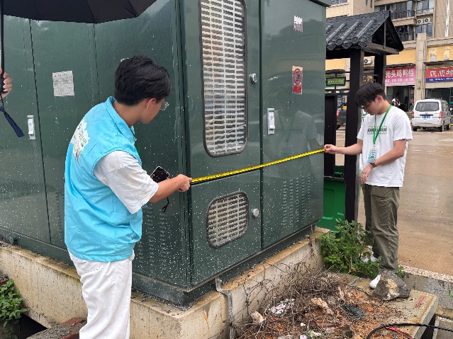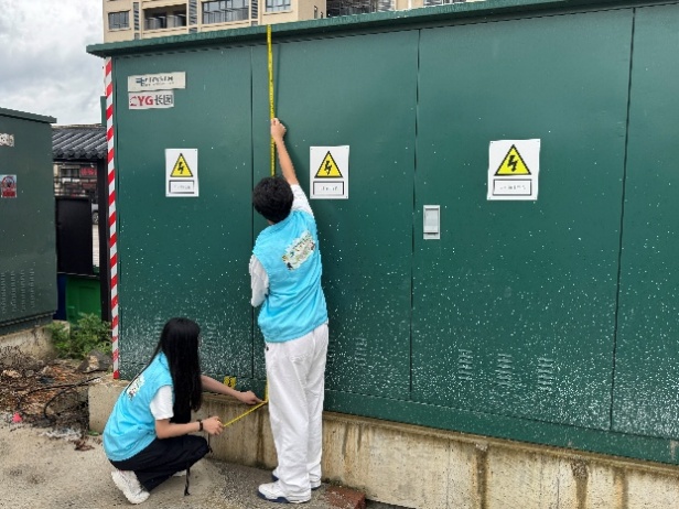 指导工作结束后,实践队前往砂塘村,针对变电箱,以专业姿态开展精准勘测。队员们手持测量工具,细致记录箱体长度、宽度、高度等关键数据。每一组数字的采集,都是与乡村基础设施的对话,为后续设计适配箱体形态,让设计从起步就贴合砂糖村实际。