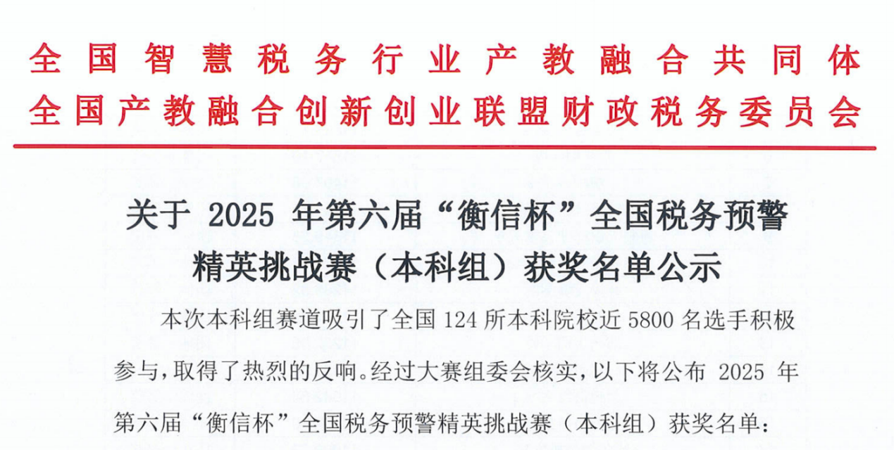 第六届“衡信杯”全国税务预警精英挑战赛(本科组)于2025年7月至8月期间举行,我校学子凭借扎实的专业知识和出色的团队协作,斩获团体一等奖等多项佳绩!