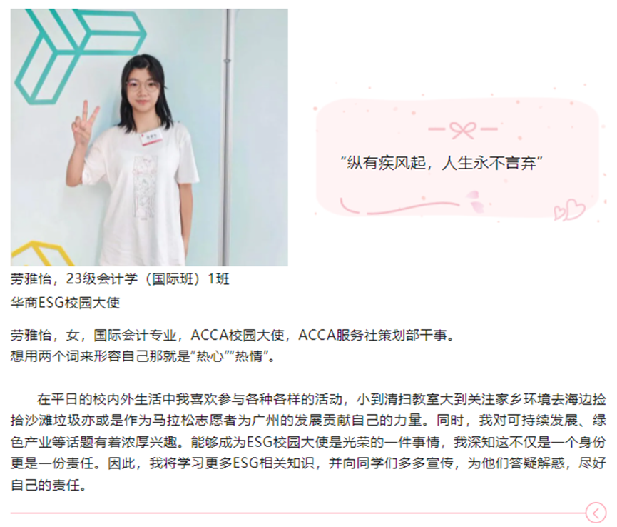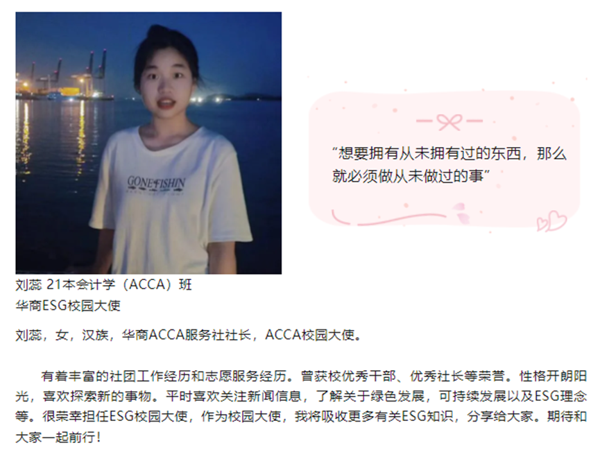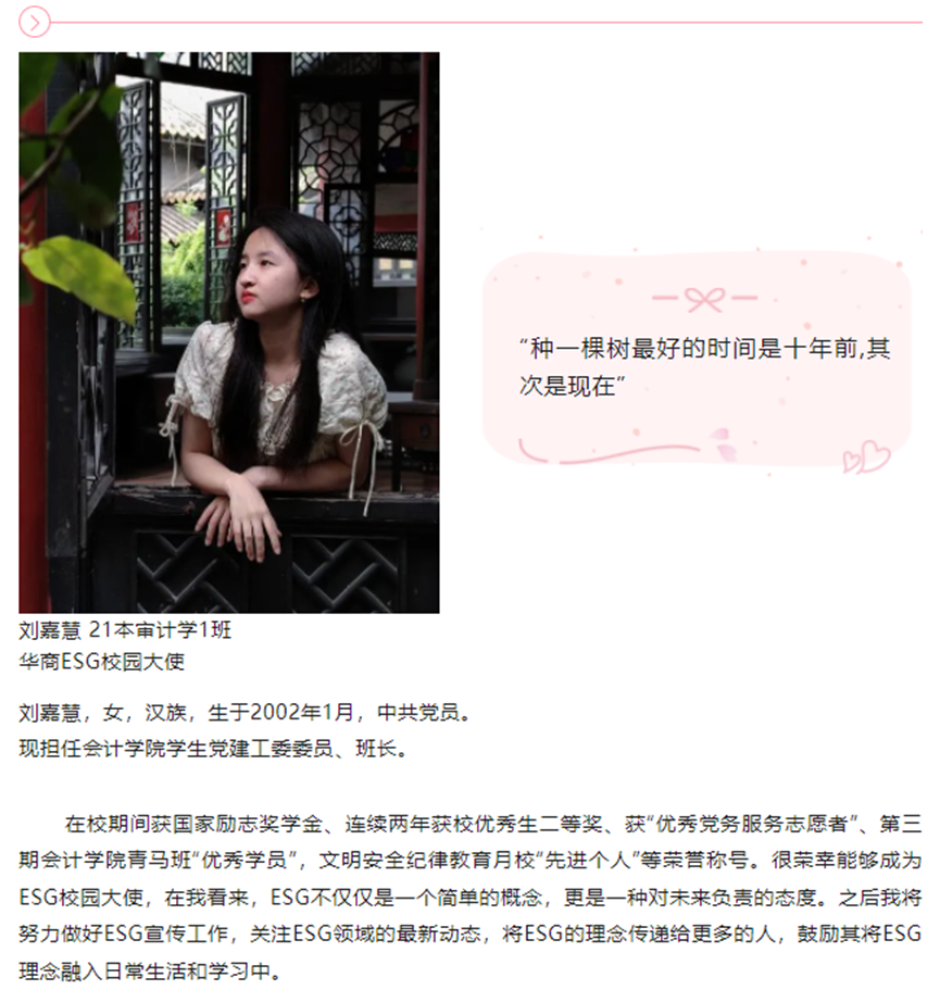 随着ESG行业的蓬勃发展与各项制度的逐步落实,在标准编制、理念推广、信息披露等方面将面临大量的ESG专业人才缺口。华商教育集团、华商bv伟德国际1946高度重视ESG人才培养。为进一步推进ESG人才培养各项工作开展,举办了第一届伟德国际victor1946ESG校园推广大使评选活动。随着校园大使评选落下帷幕,来自bv伟德国际1946的刘佳慧、刘蕊同学,国际学院的劳雅怡同学脱颖而出。在接下来的活动中,他们将承担各项工作任务,一展风采。