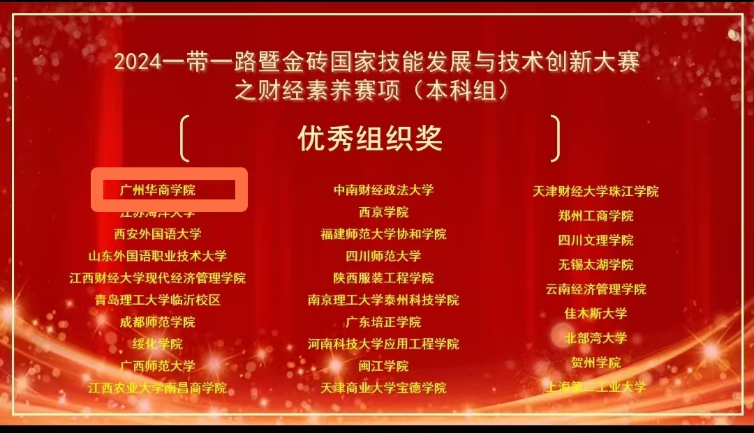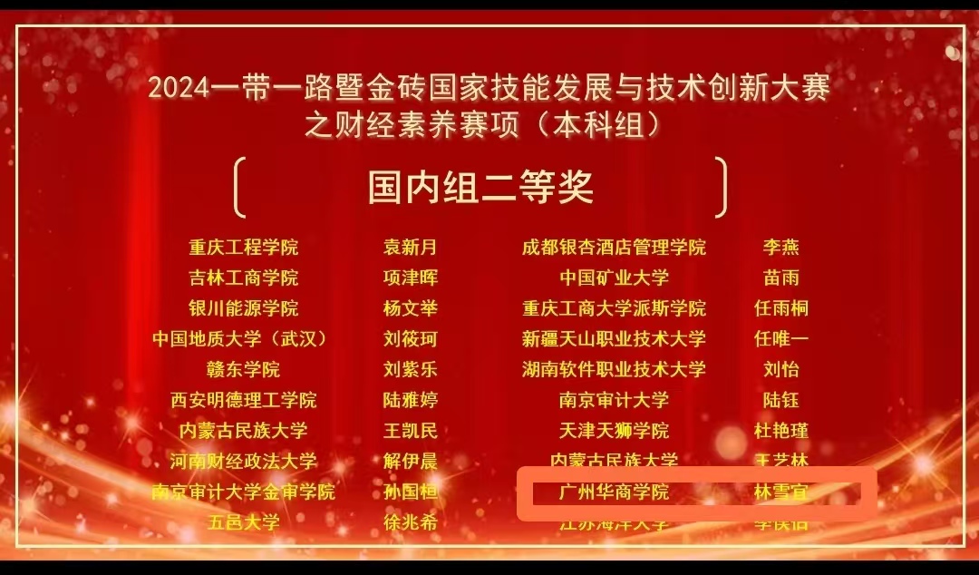 11月24日,由金砖国家工商理事会中方理事会、一带一路暨金砖国家技能发展国际联盟、中国科协“一带一路”暨金砖国家技能发展与技术创新培训中心主办的“2024一带一路暨金砖国家技能发展与技术创新大赛之第二届财经素养赛项”(本科组)全国决赛圆满落幕。来自上海财经大学、南京师范大学、首都经济贸易大学、闽南师范大学、新疆天山职业技术大学等全国206所高校的400多名学生参加了决赛。华商bv伟德国际1946两名会计学专业学生代表学校两支队伍在全国206所院校参赛队伍中脱颖而出,取得国内组二等奖和优秀奖。伟德国际victor1946荣获“优秀组织奖”。其中郭美娣老师、何子昉老师指导的林雪宜同学获大赛二等奖;陈顺意老师、罗永桂老师指导的陈诗雨同学获得优秀奖。